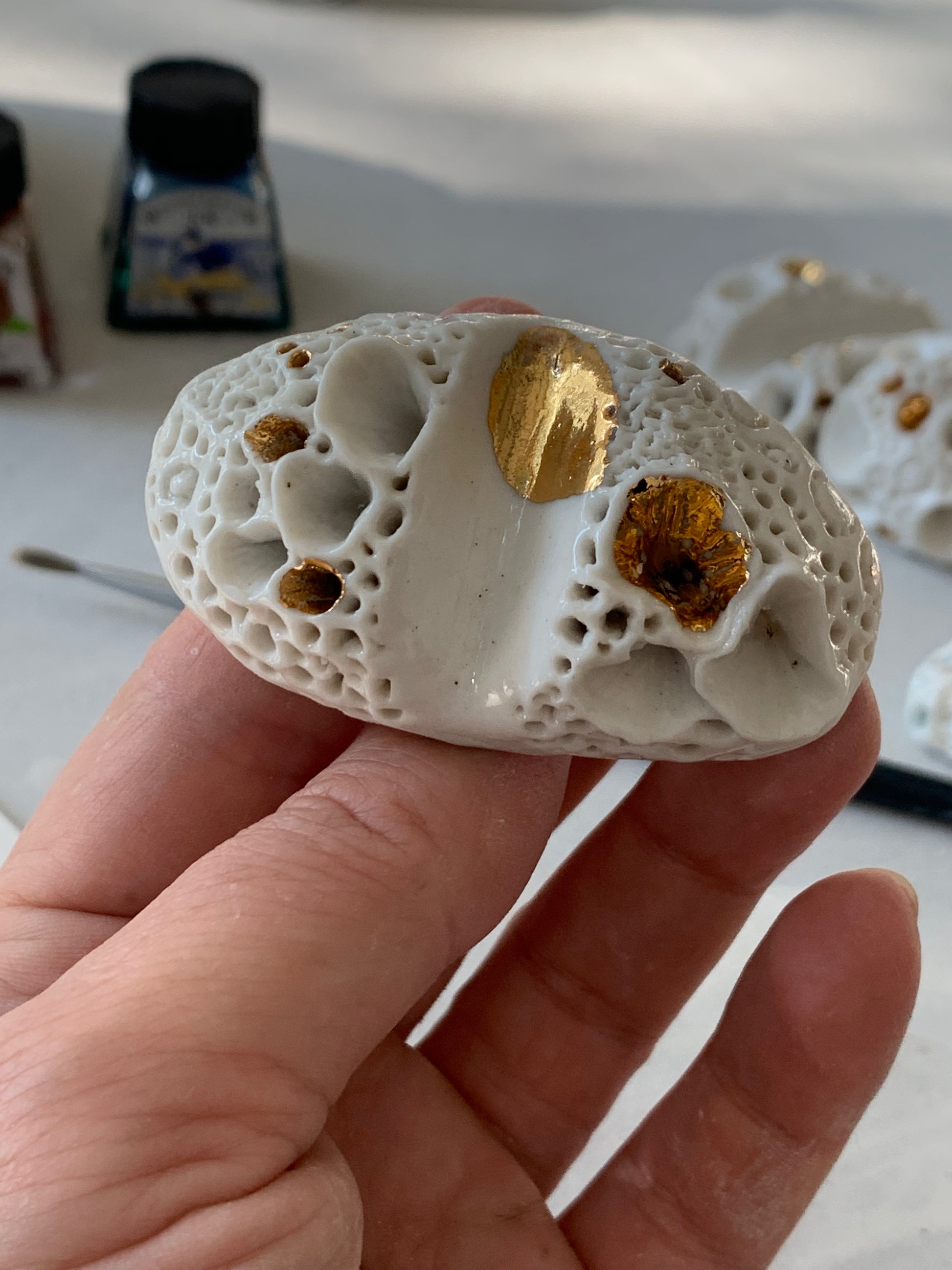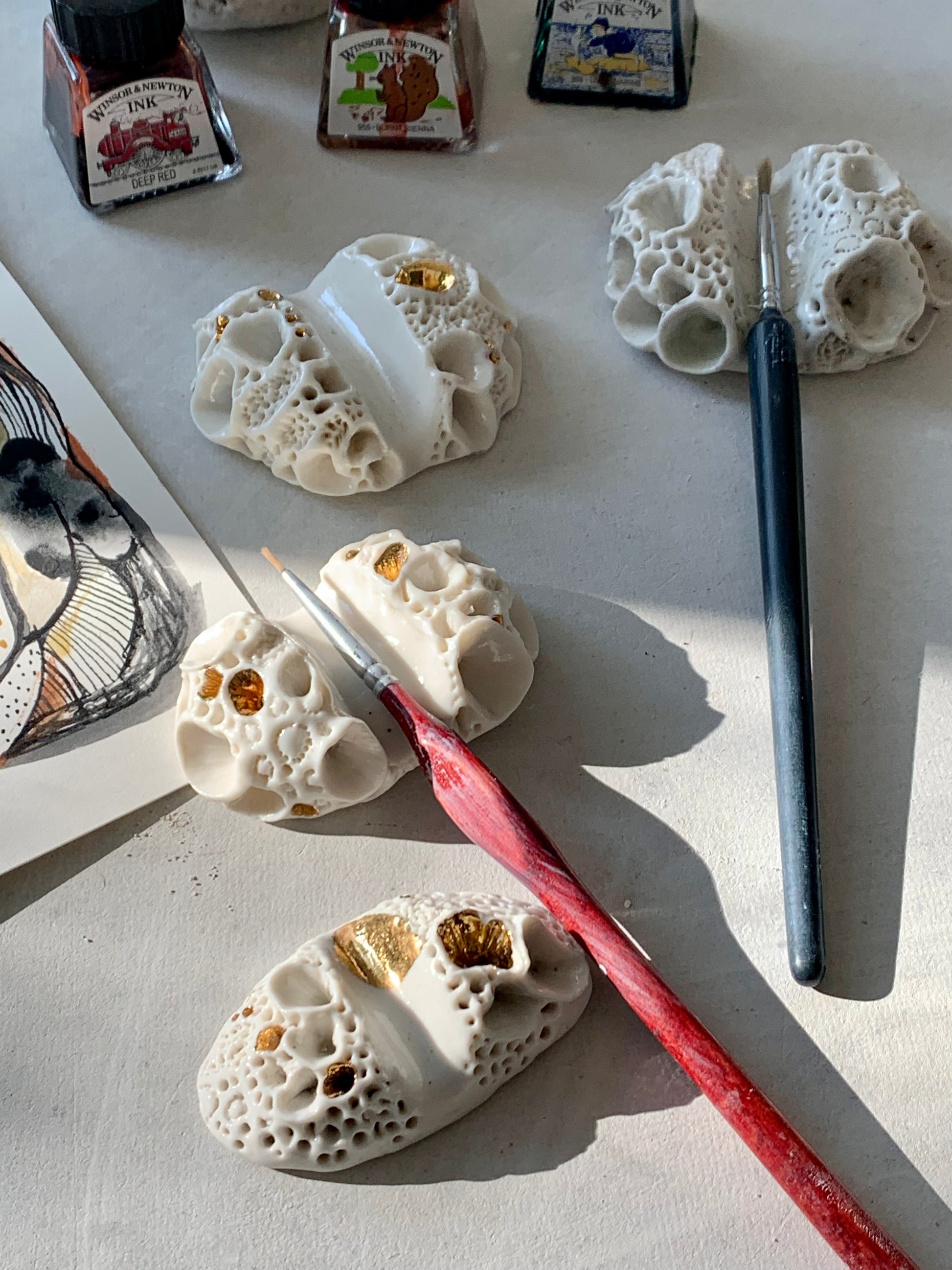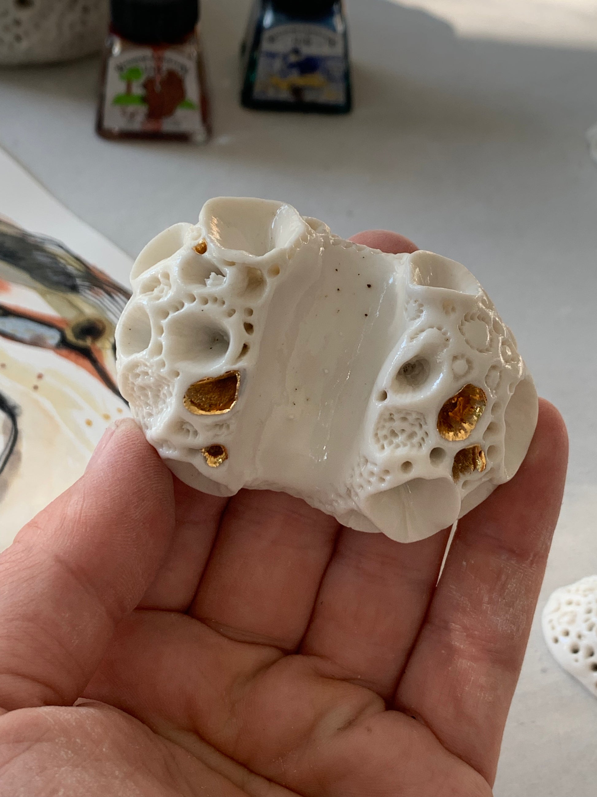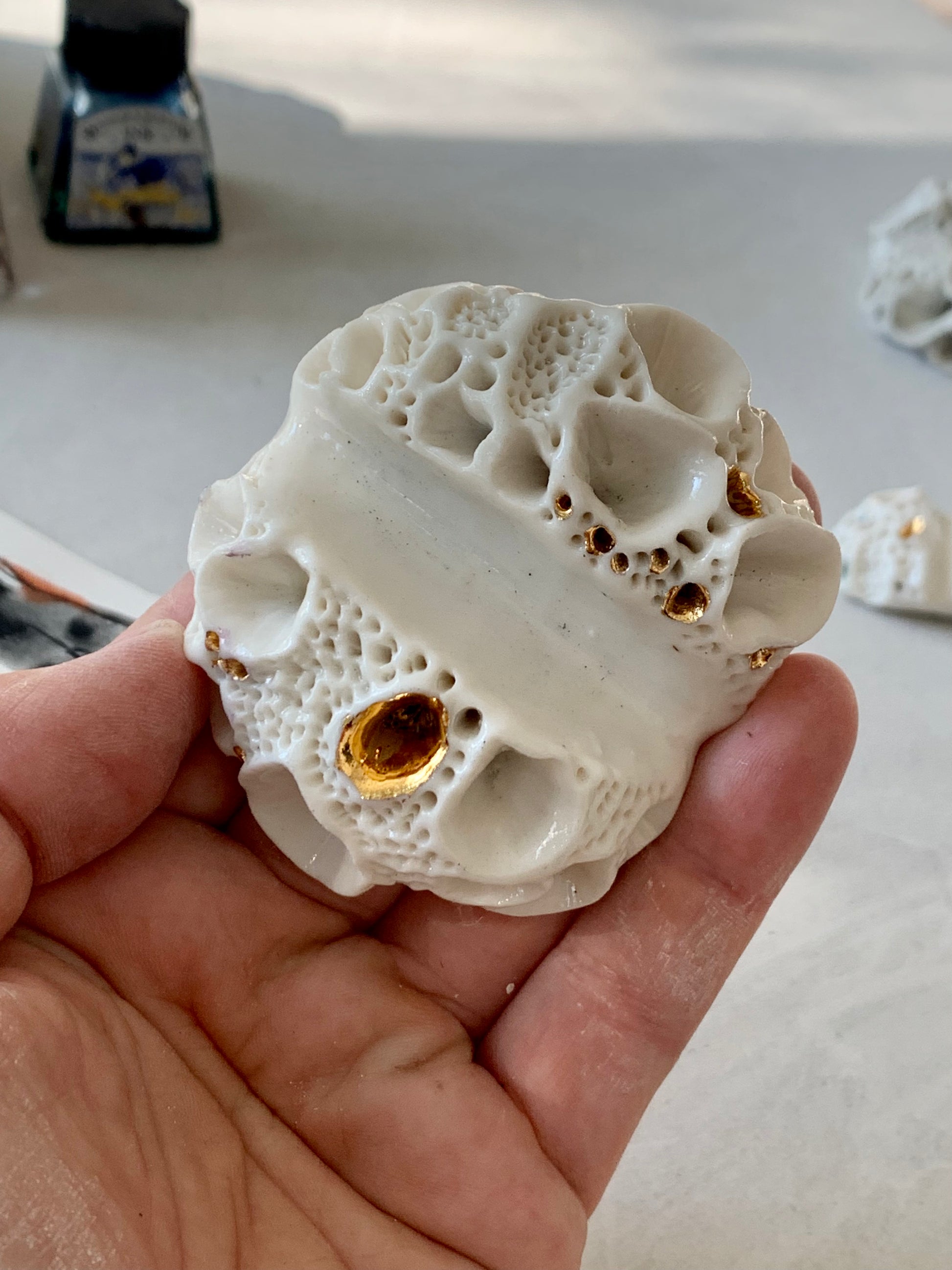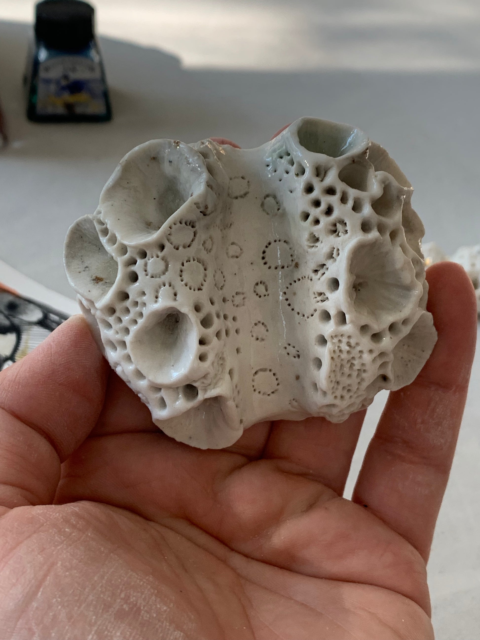 Hand formed and textured porcelain paintbrush/ pen rest, textured to give a ‘coral’ feel.