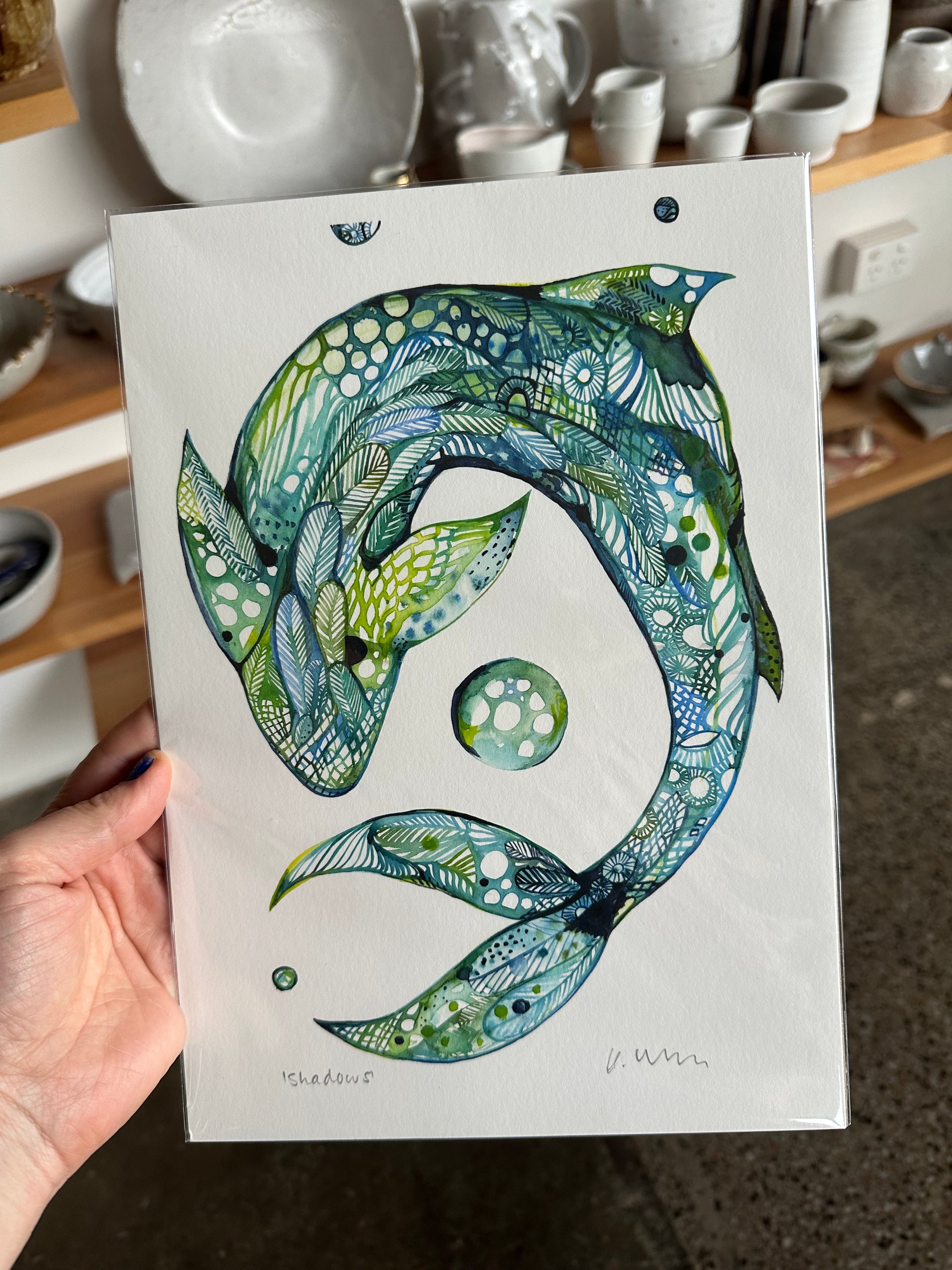 This drawing is inspired by looking through sparkling ocean water, and seeing the shadows of objects and small fish swimming through the water below. You see beautiful outlines, overlayed with the sun shining off the water, distorting the shapes underneath.
