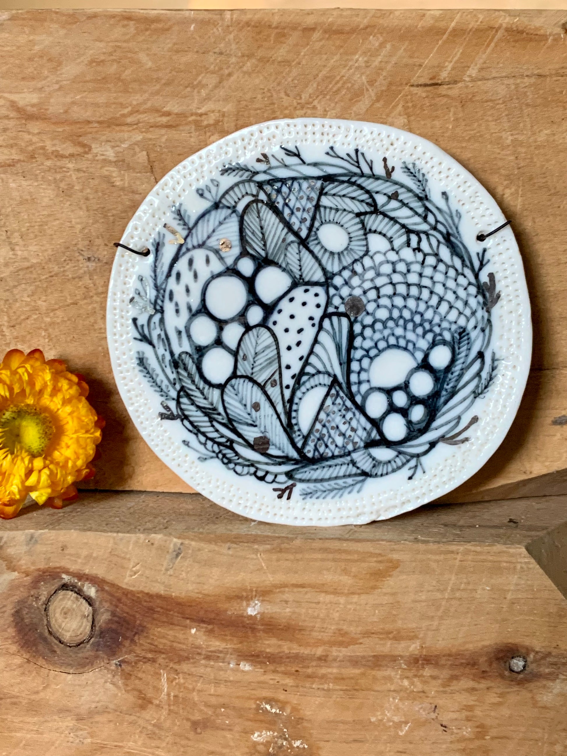 Small Indigo ‘Seafoam’ porcelain wall piece with platinum detail
