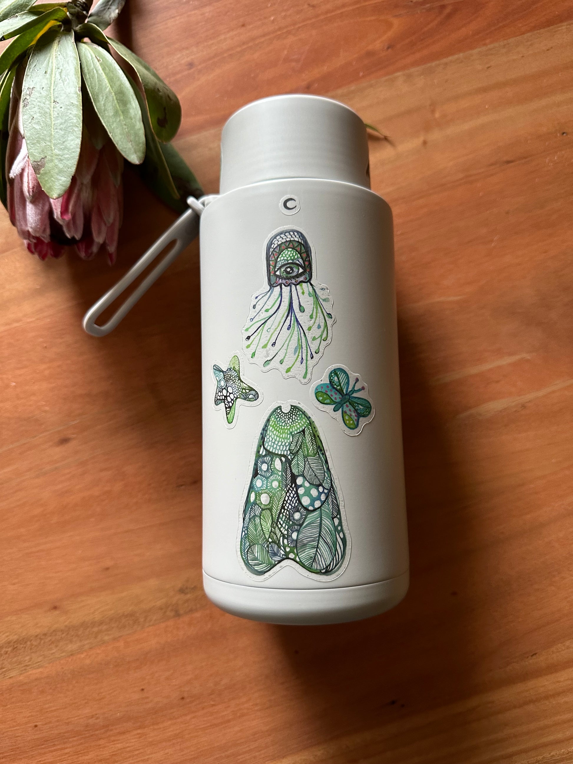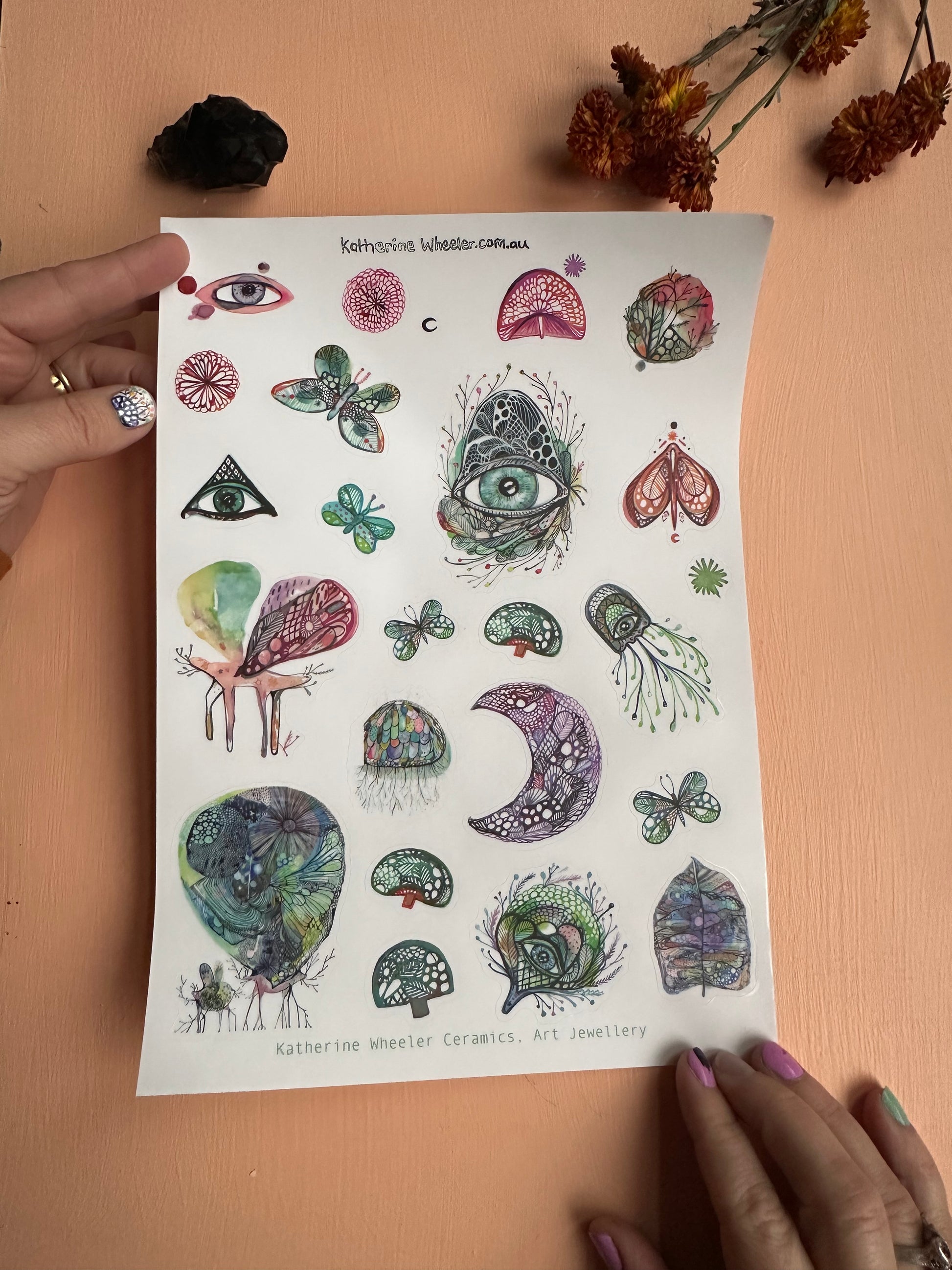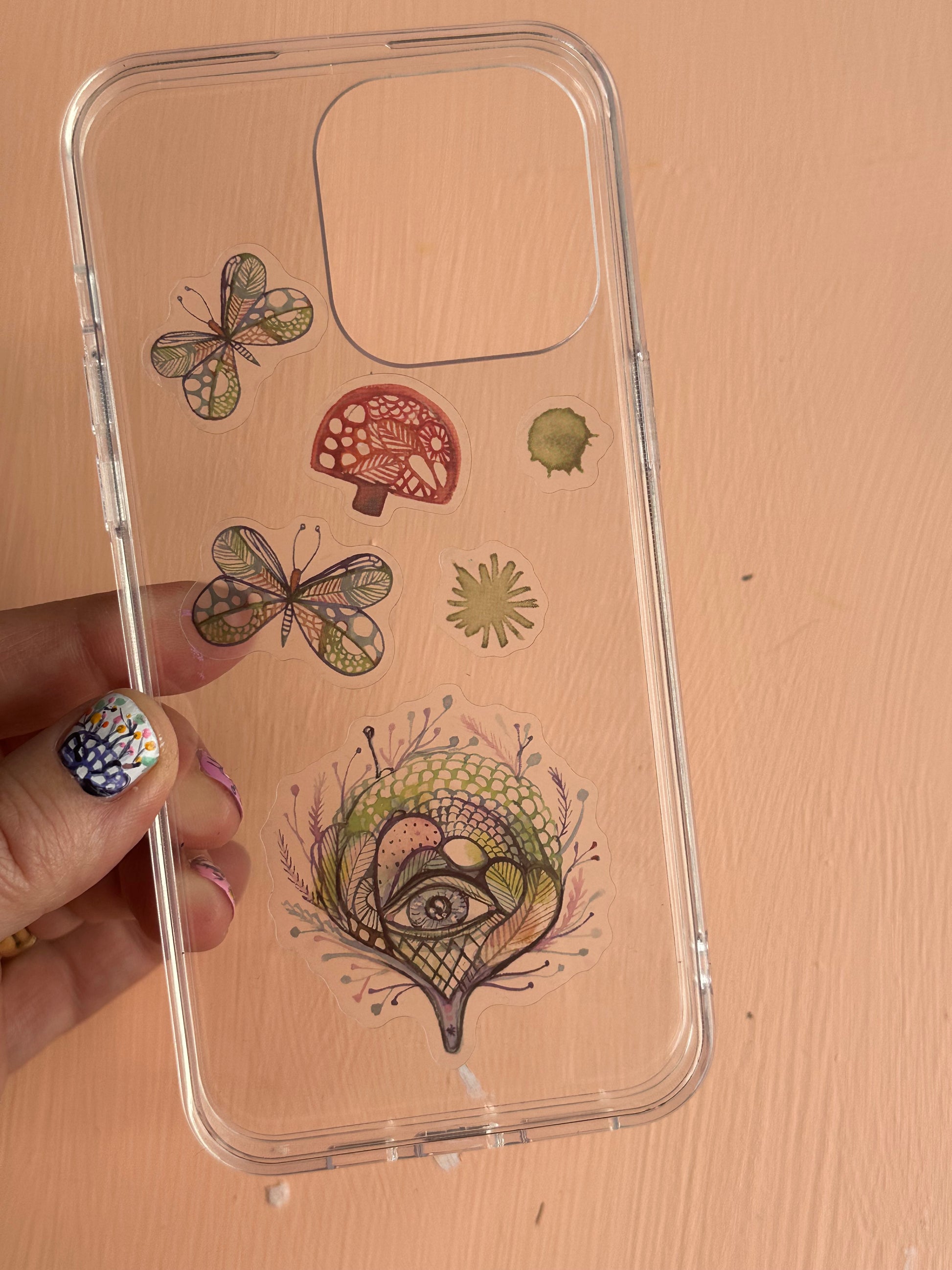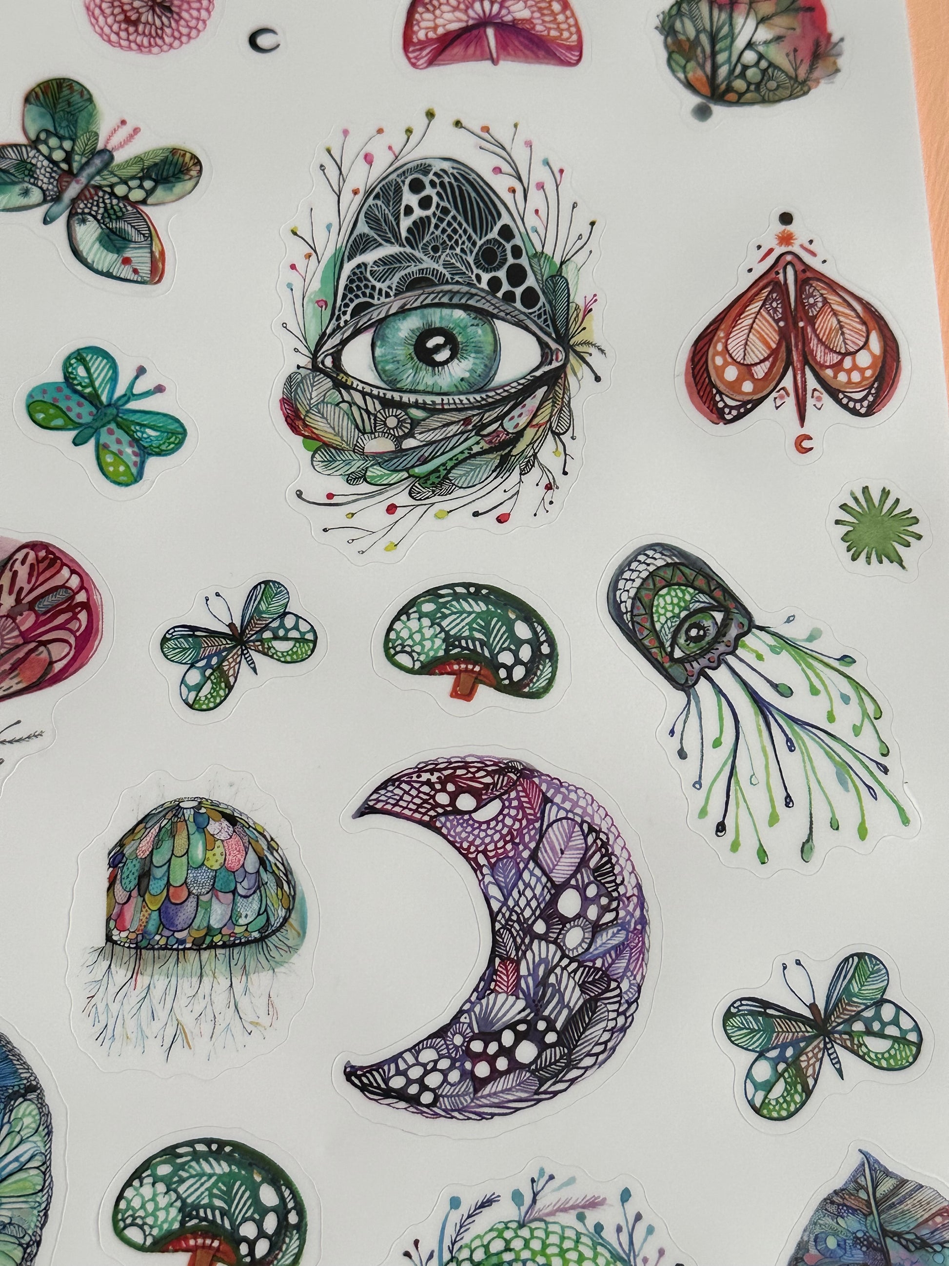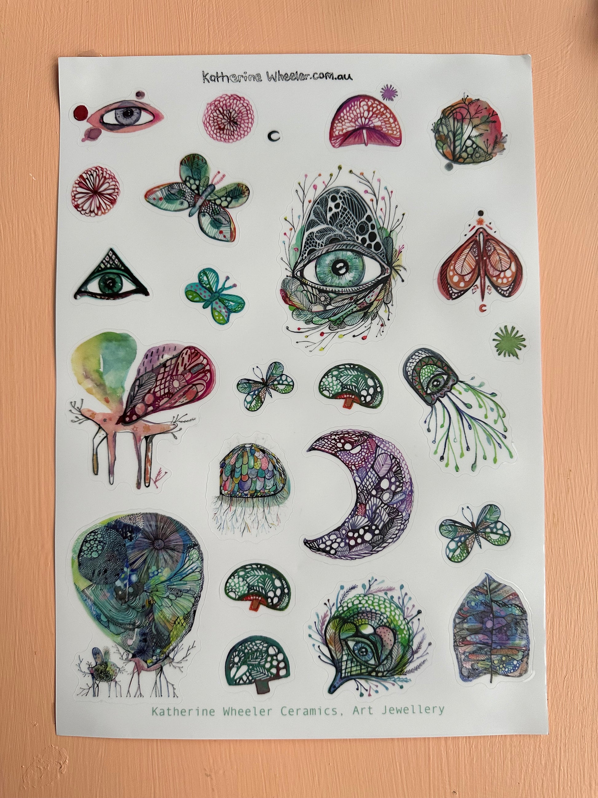 A4 transparent sticker sheet ‘The protective eye’ design, featuring original drawings and artworks by Katherine Wheeler.