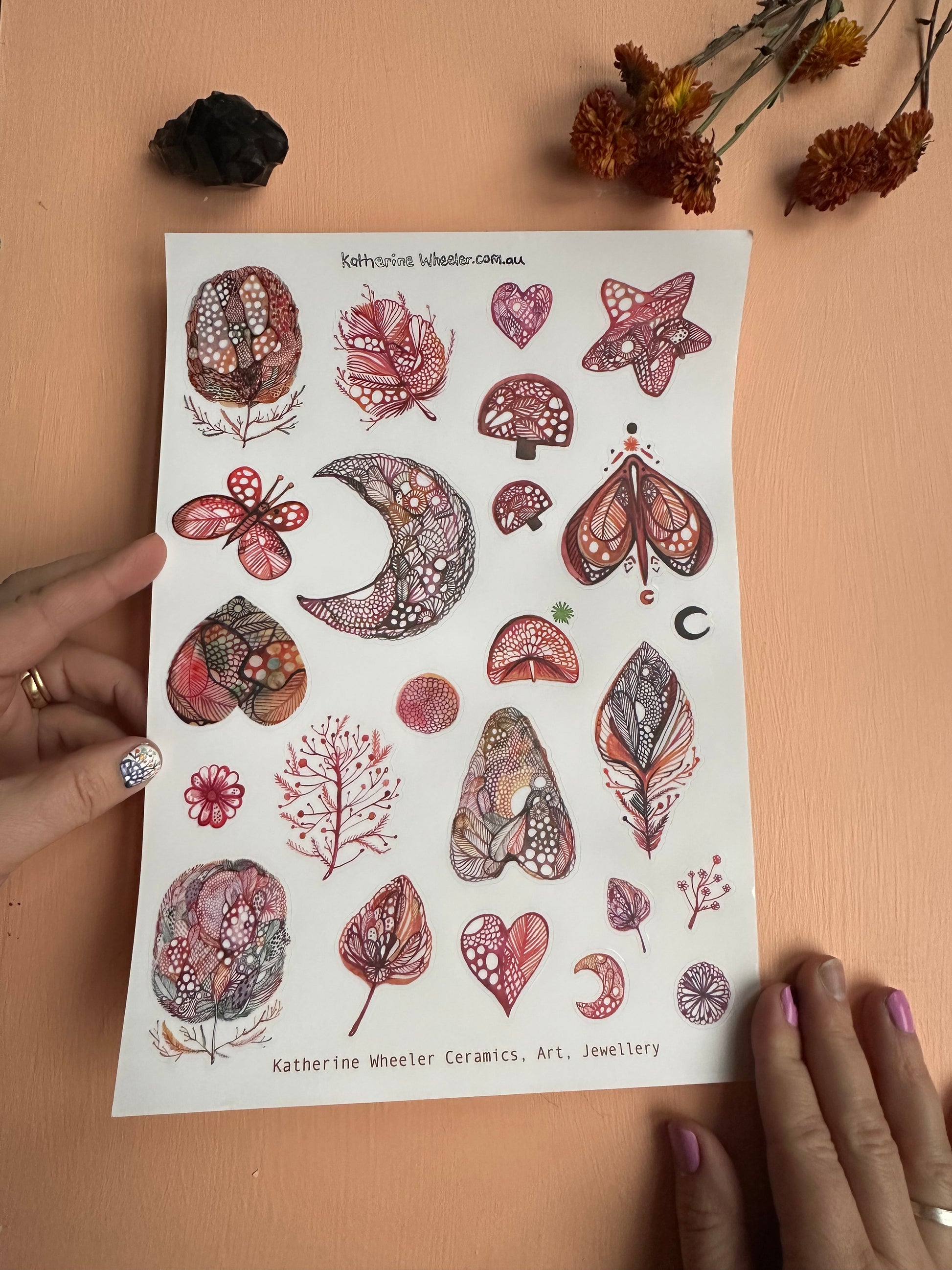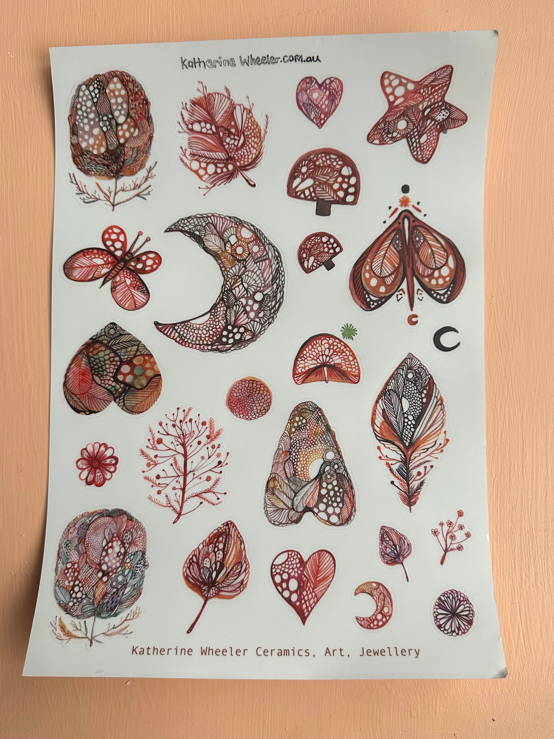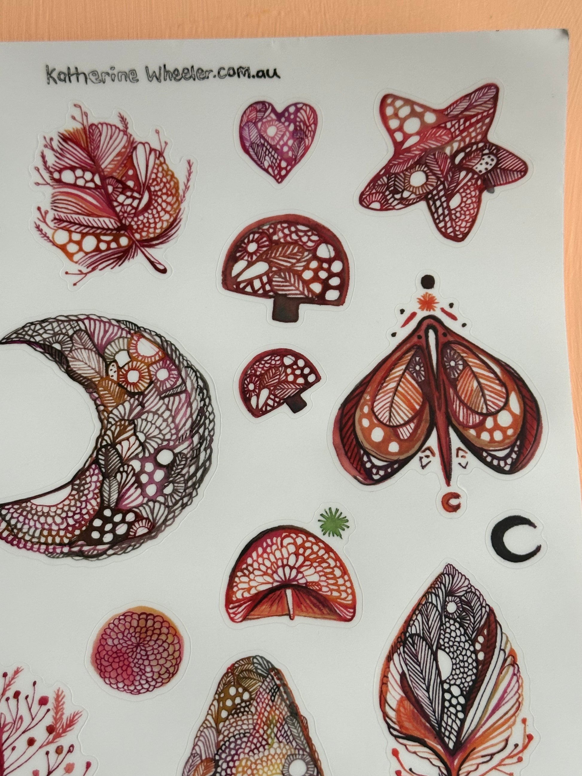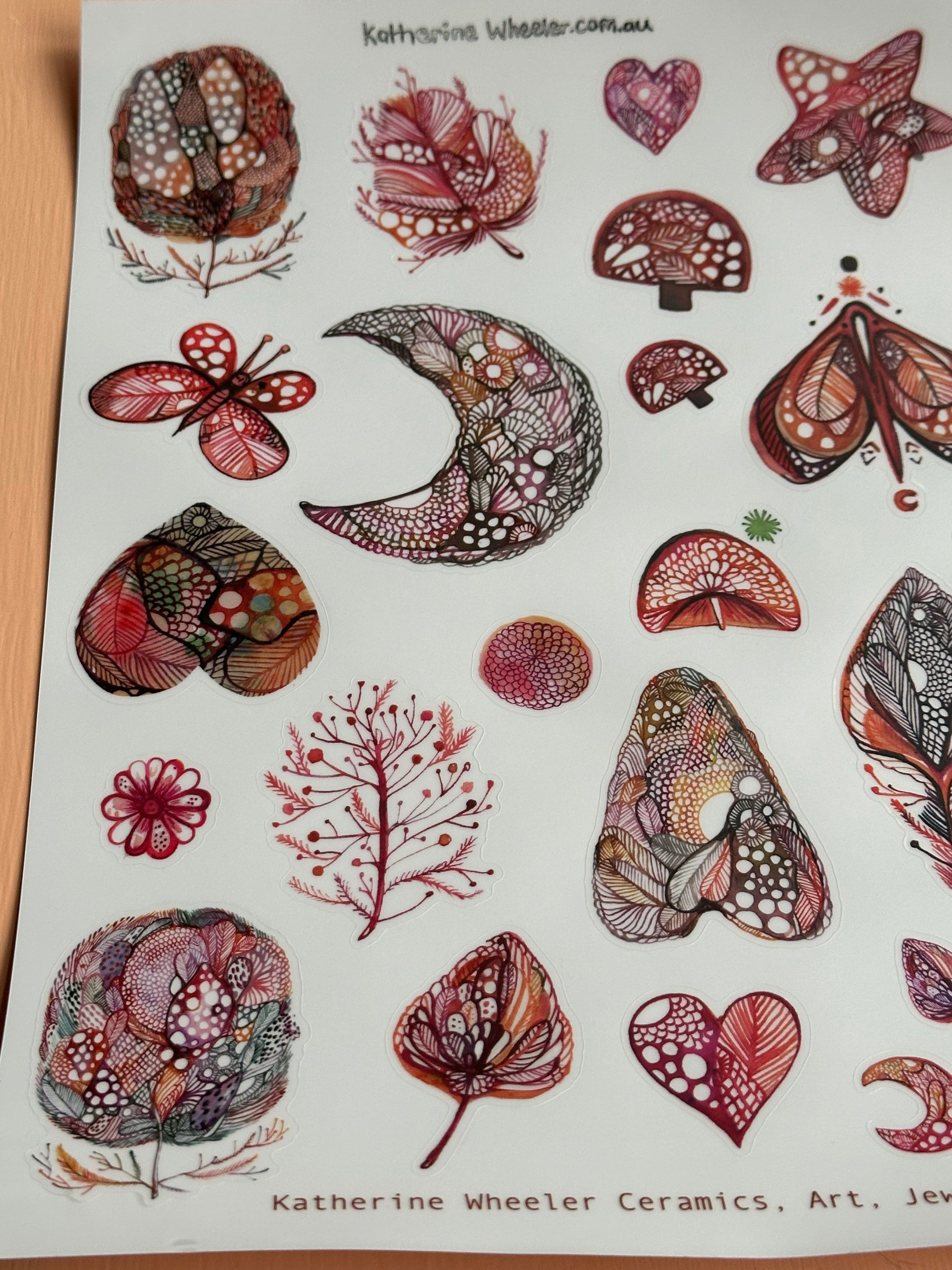A4 transparent sticker sheet a selection of ‘Red’ designs, featuring original drawings and artworks by Katherine Wheeler.