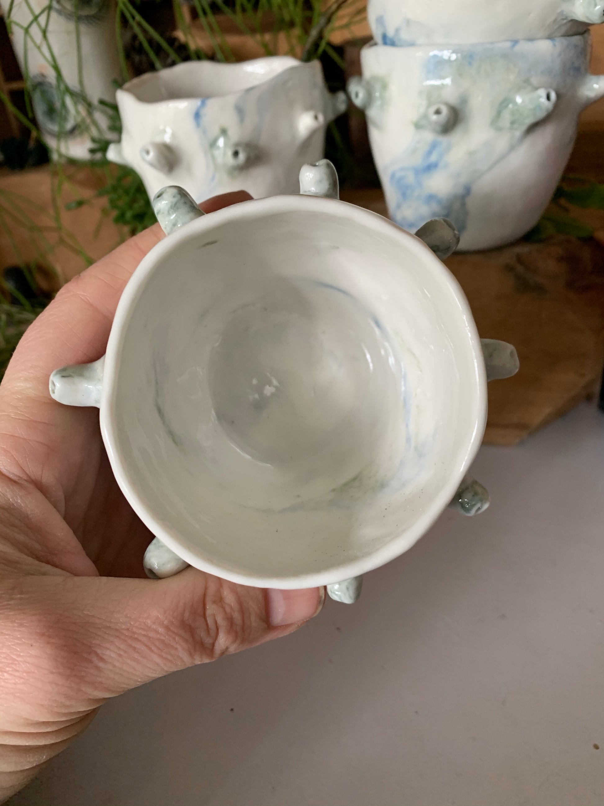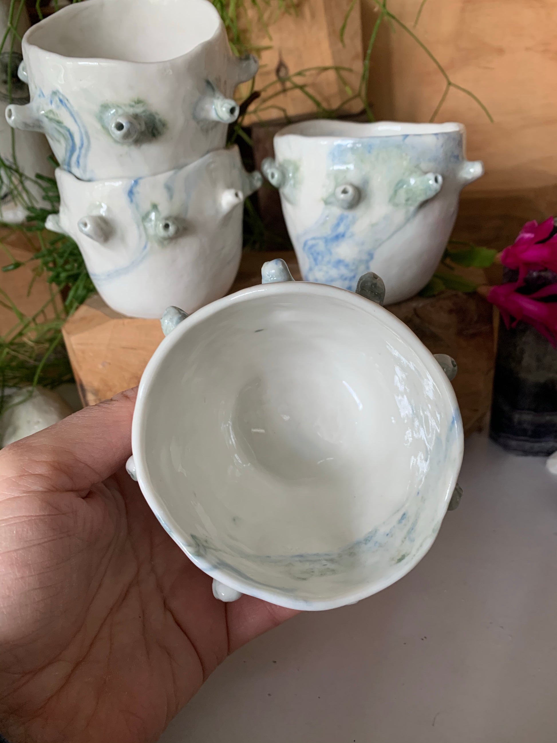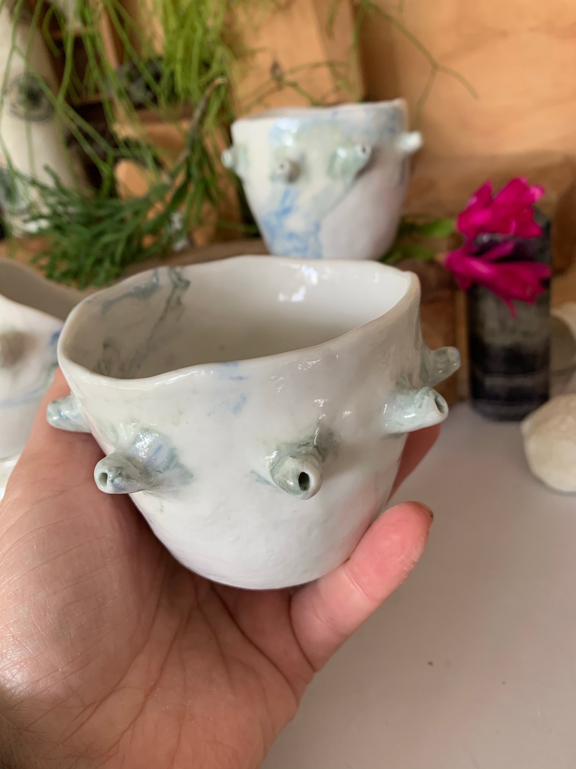 These cups are inspired by sea urchin spines, and the love of using a cup with no handle- but sometimes needing a little protection between the heat of the cup and your hand. The ‘spines’ can be used to protect your hands from the heat :)