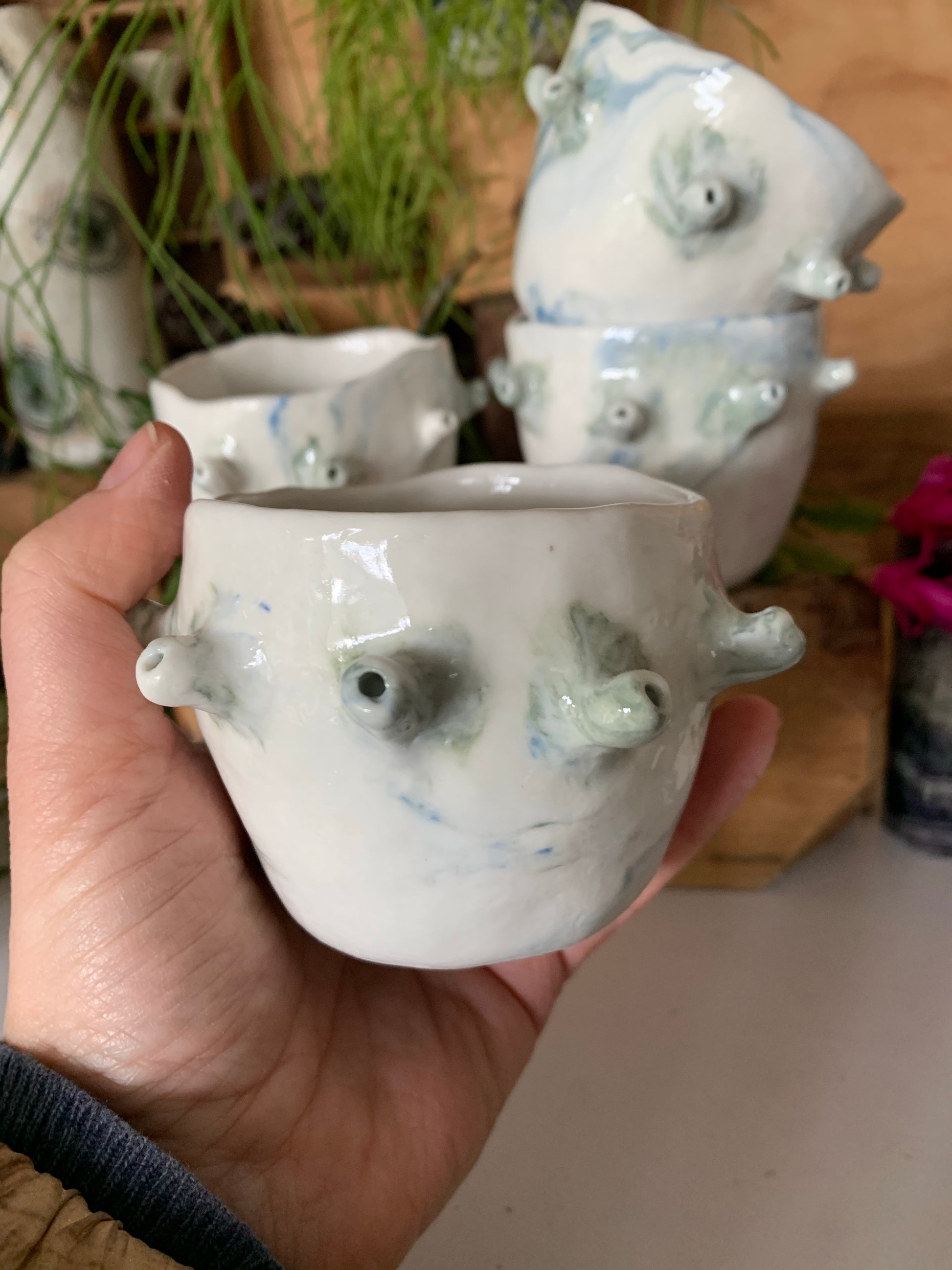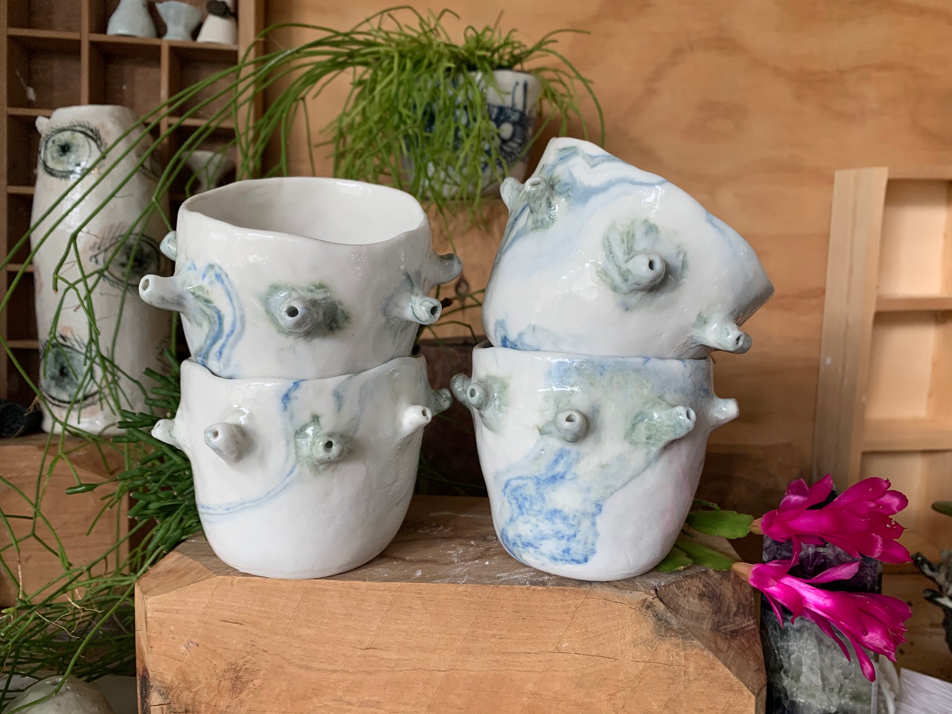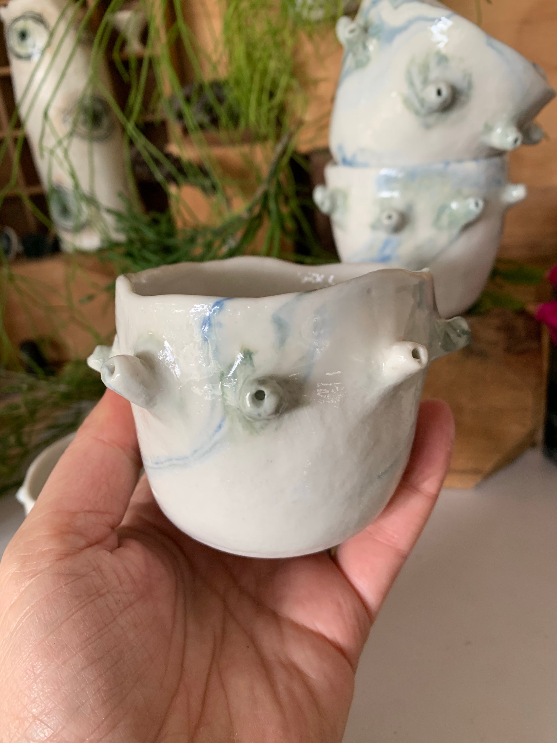 These cups are inspired by sea urchin spines, and the love of using a cup with no handle- but sometimes needing a little protection between the heat of the cup and your hand. The ‘spines’ can be used to protect your hands from the heat :)